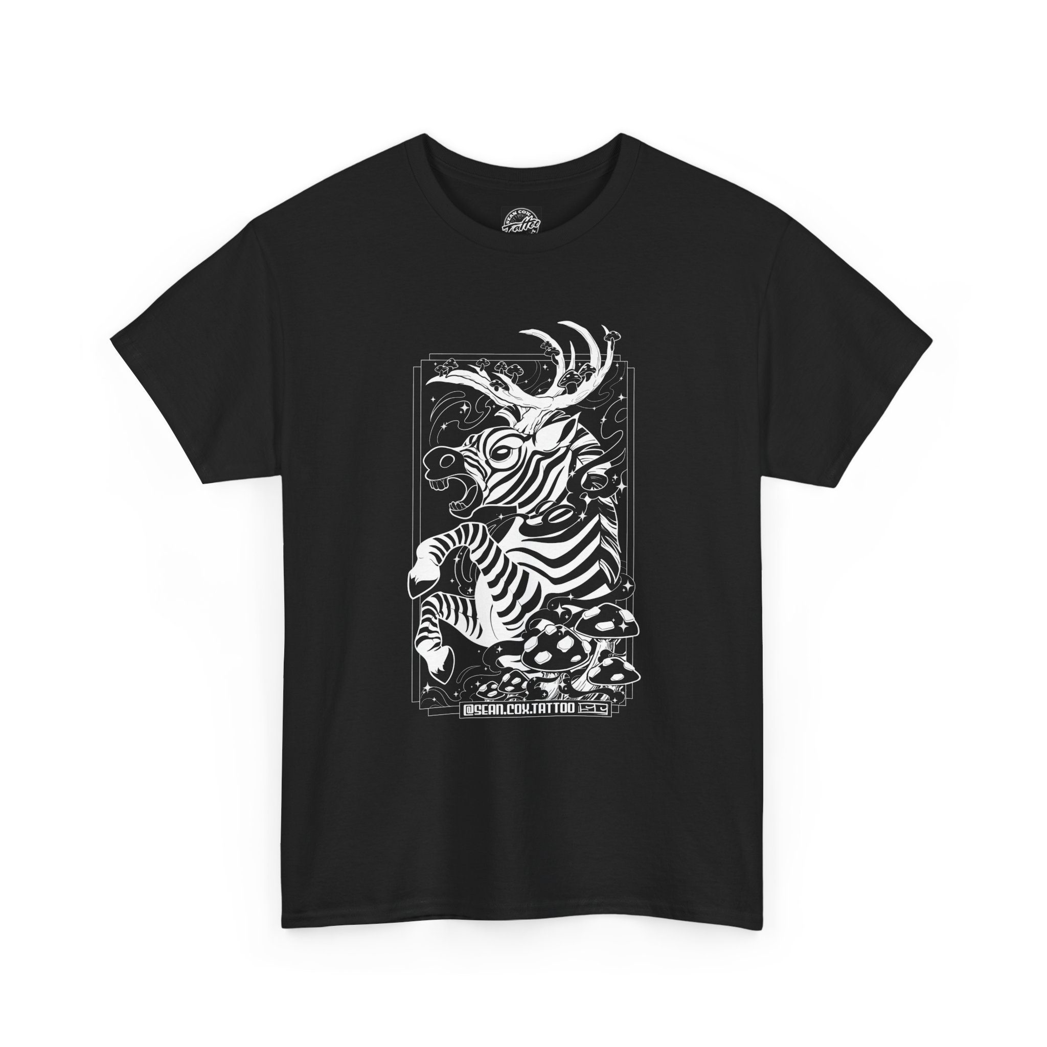 Black cotton tee with a bold monochrome illustration — part stag, part zebra — that feels like inked folklore come alive. The high-contrast print sits in a rectangular frame on the chest, drawing the eye into swirling stripes, antlers and textured details that read like a midnight story. Wear it to add a dark, artful edge to layered street looks or to carry a quiet, mythic mood on late-night walks and small gallery nights. The cloth is substantial yet breathable, holding shape through washes so the graphic stays crisp. It settles like a familiar companion: low-key, expressive, and made to be lived in.