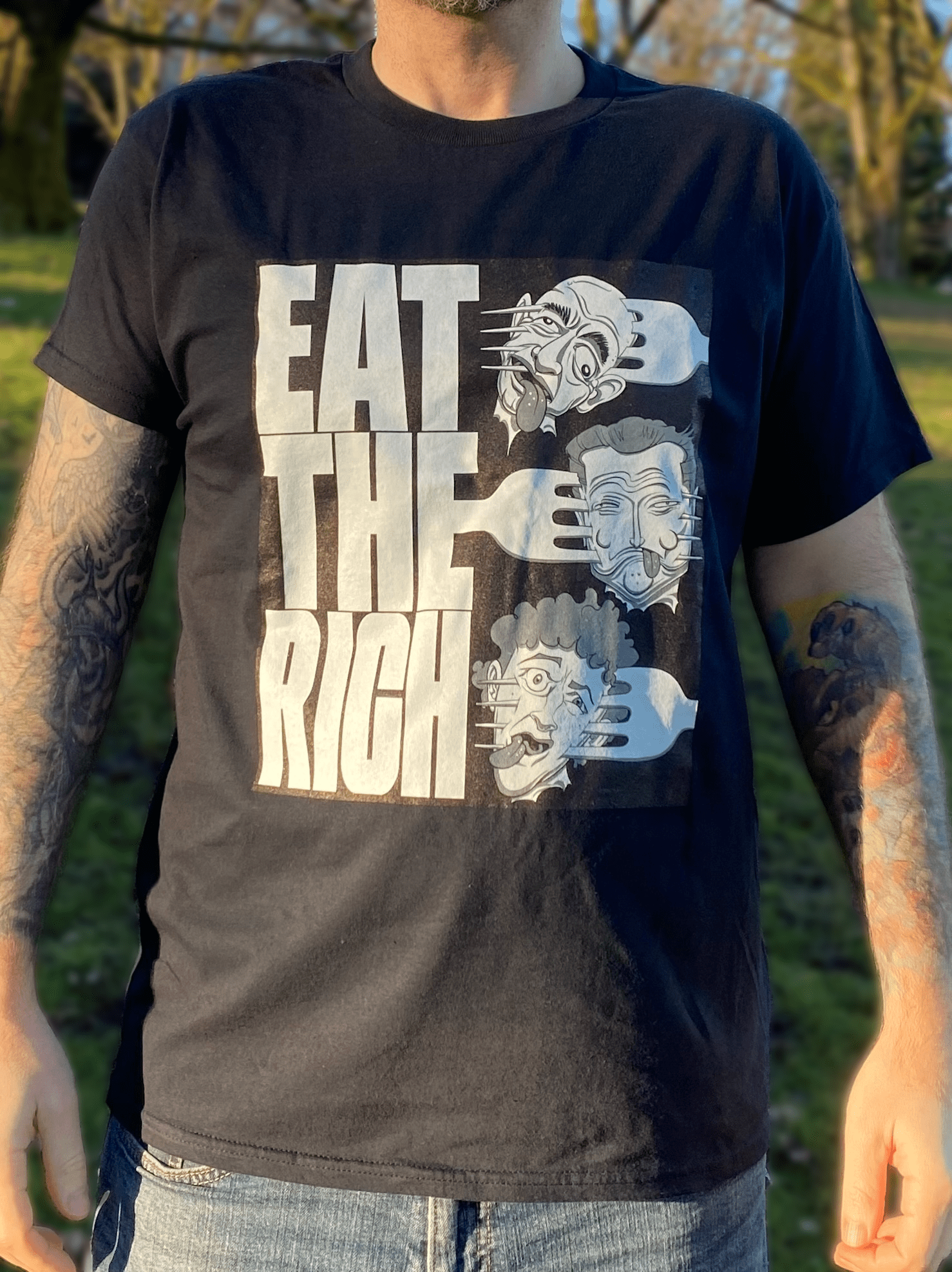 A bold “EAT THE RICH” layout paired with three extremely recognizable tech-world faces getting skewered—literally. If you’ve ever side-eyed billionaire worship, corporate saviors, or trillion-dollar egos, this one’s for you.