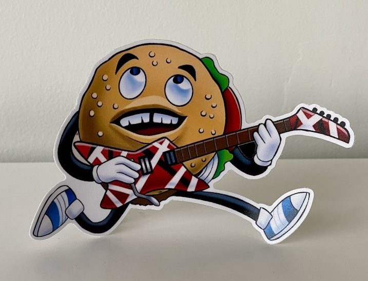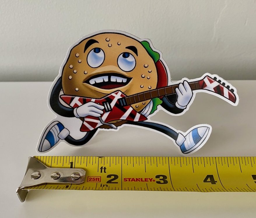 This 4.5 inch vinyl die-cut sticker features a leaping burger absolutely shredding on a Van Halen–style guitar, riffing on the classic animated burger moment from Better Off Dead.