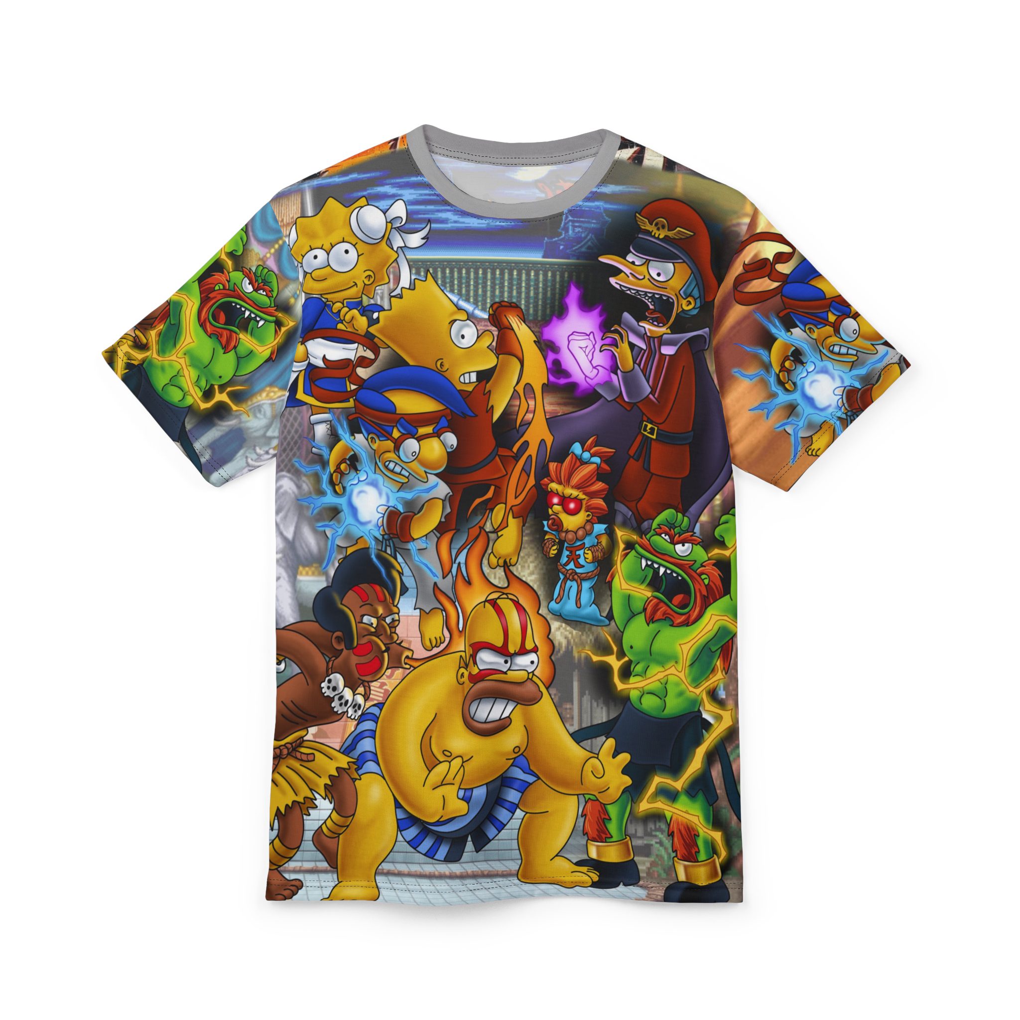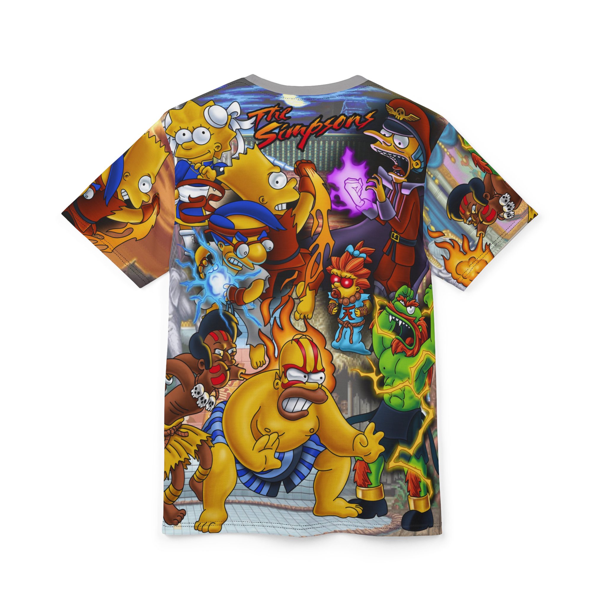 From Homer in sumo mode to Lisa mid-lightning kick, and Mr. Burns channeling full-on final boss vibes, this all-over print tee is a chaotic love letter to Saturday morning cartoons and quarter-munching arcade glory. Every inch is a riot of color and action that wraps around your body like a punch combo.